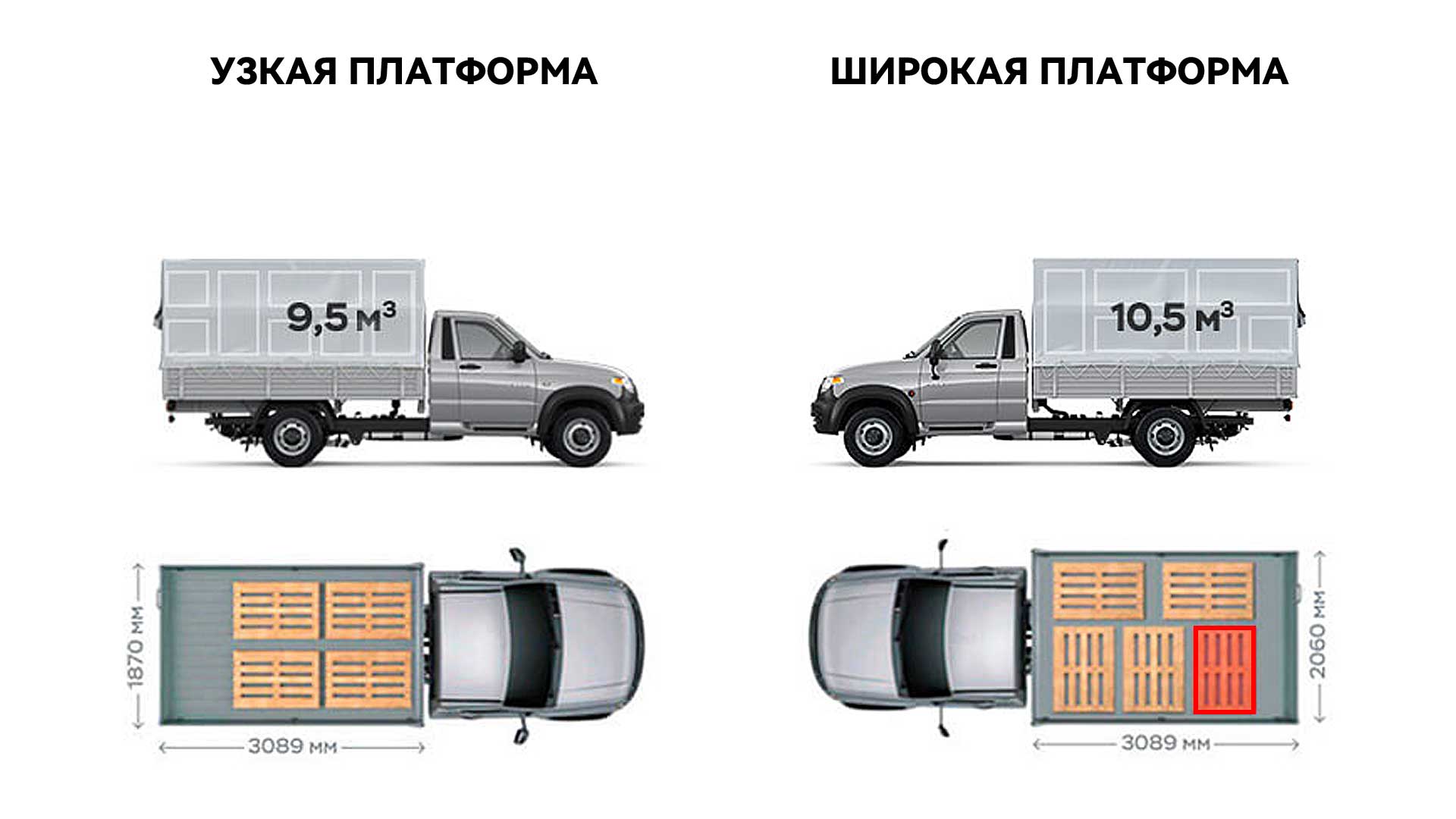 - Нюанс: Если вы возите грузы на паллетах, «узкая» платформа съедает вашу рентабельность. Вы везете воздух там, где могли бы везти товар.