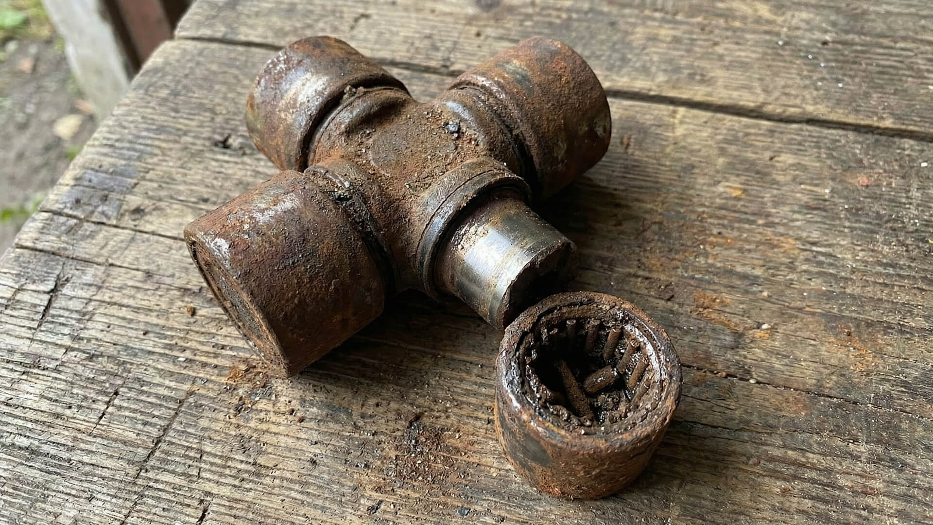 Карданный вал на УАЗе работает под большими углами. В крестовинах стоят игольчатые подшипники. Если там нет смазки, или старая смазка смешалась с водой и грязью, получается абразивная паста. Она сжирает металл за пару месяцев активной езды.